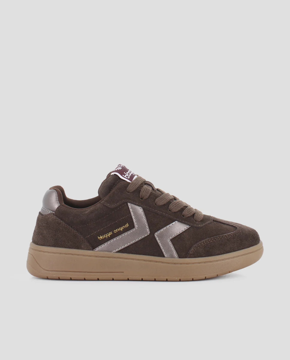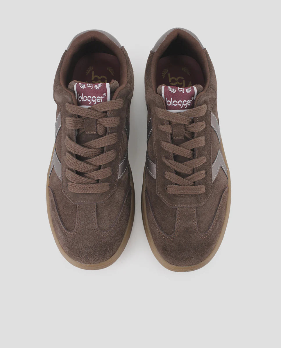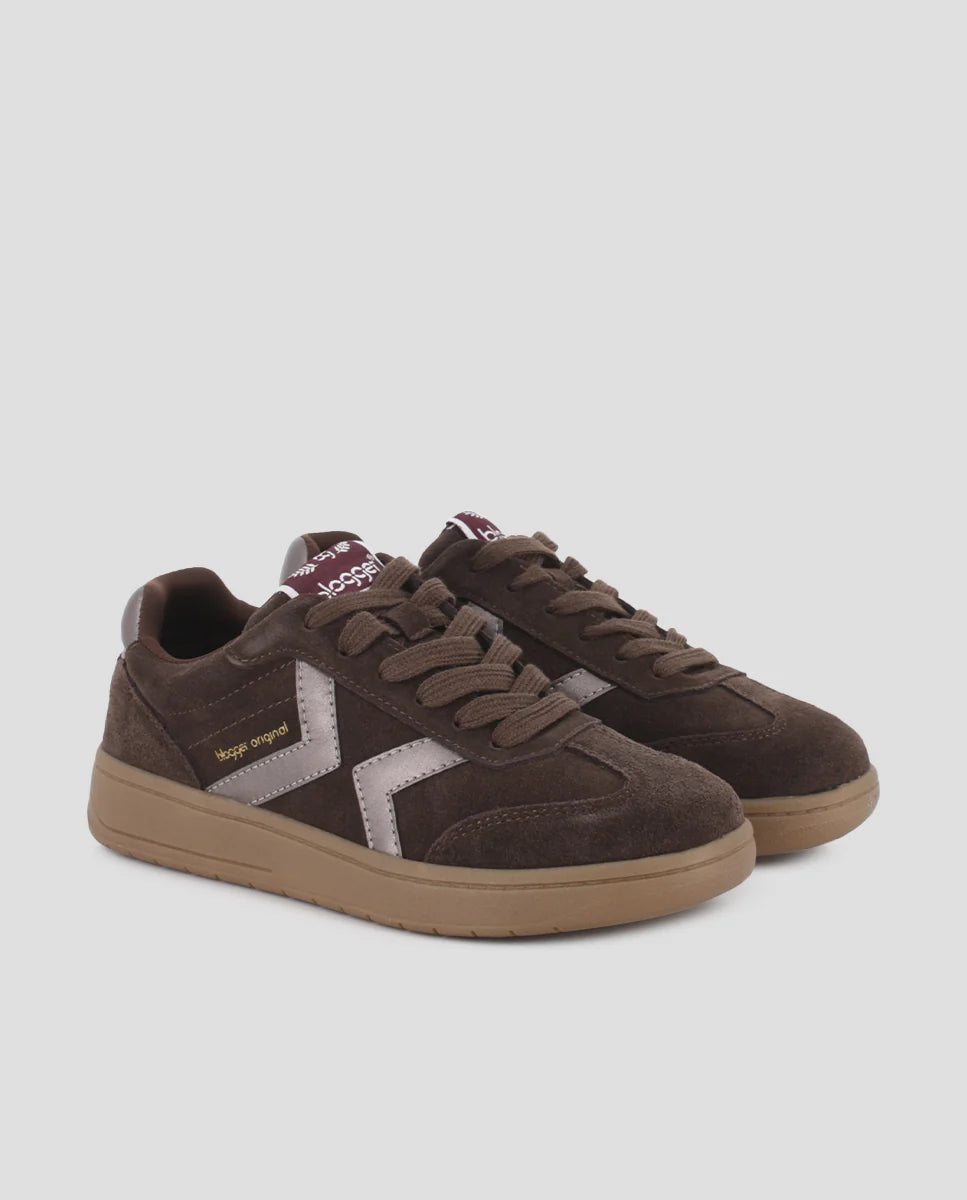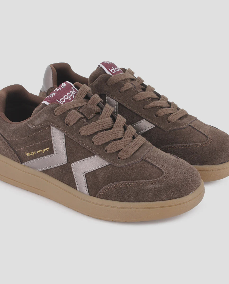 Elaboradas en piel de serraje sintético de color marrón cálido, estas zapatillas destacan por su elegante detalle plateado en el lateral que añade un toque moderno y sofisticado a cualquier outfit. Con un piso plano de 3 cm de altura, ofrecen la comodidad necesaria para llevar durante todo el día sin renunciar al estilo casual.