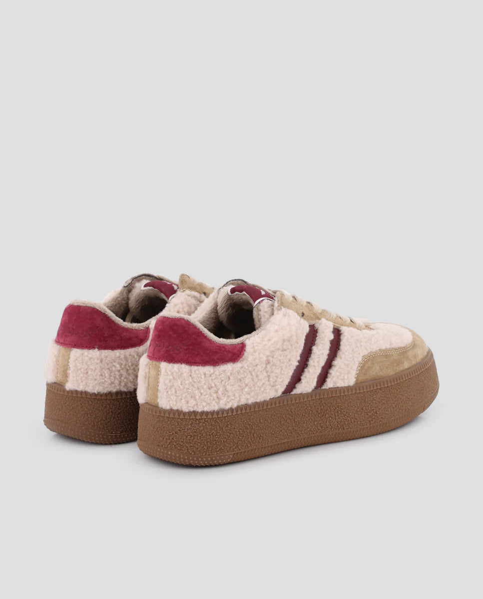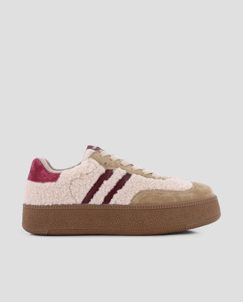 Estas zapatillas beige destacan por su material sintético con una deliciosa textura de peluche que las hace irresistiblemente suaves al tacto, complementado con detalles en serraje sintético que añaden sofisticación. Los acentos en tonos burdeos y marrón crean un contraste visual elegante que eleva cualquier look casual. La plataforma de 3,5 cm proporciona la altura justa para estilizar tu figura sin comprometer la comodidad, permitiéndote llevarlas durante todo el día sin fatiga.