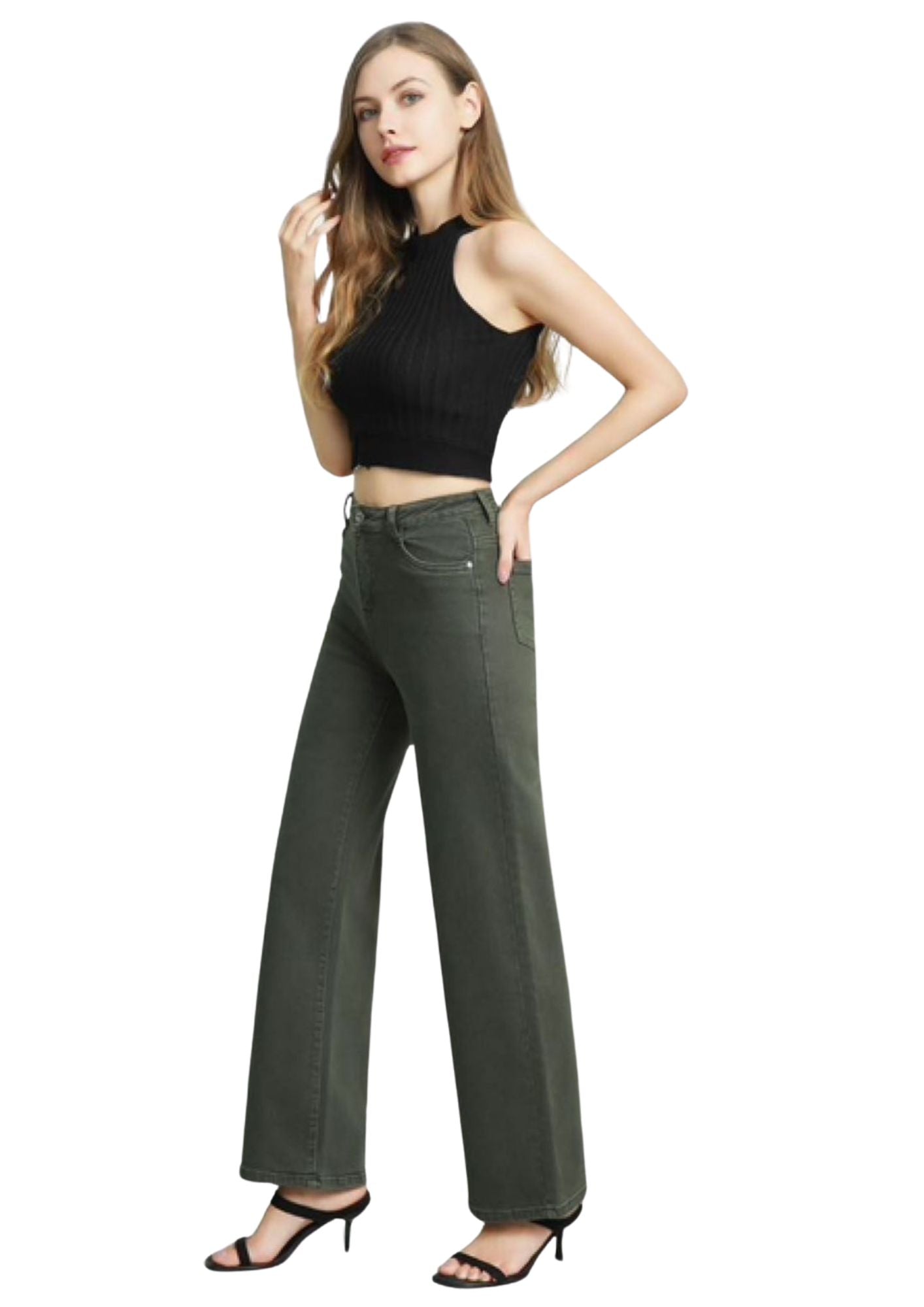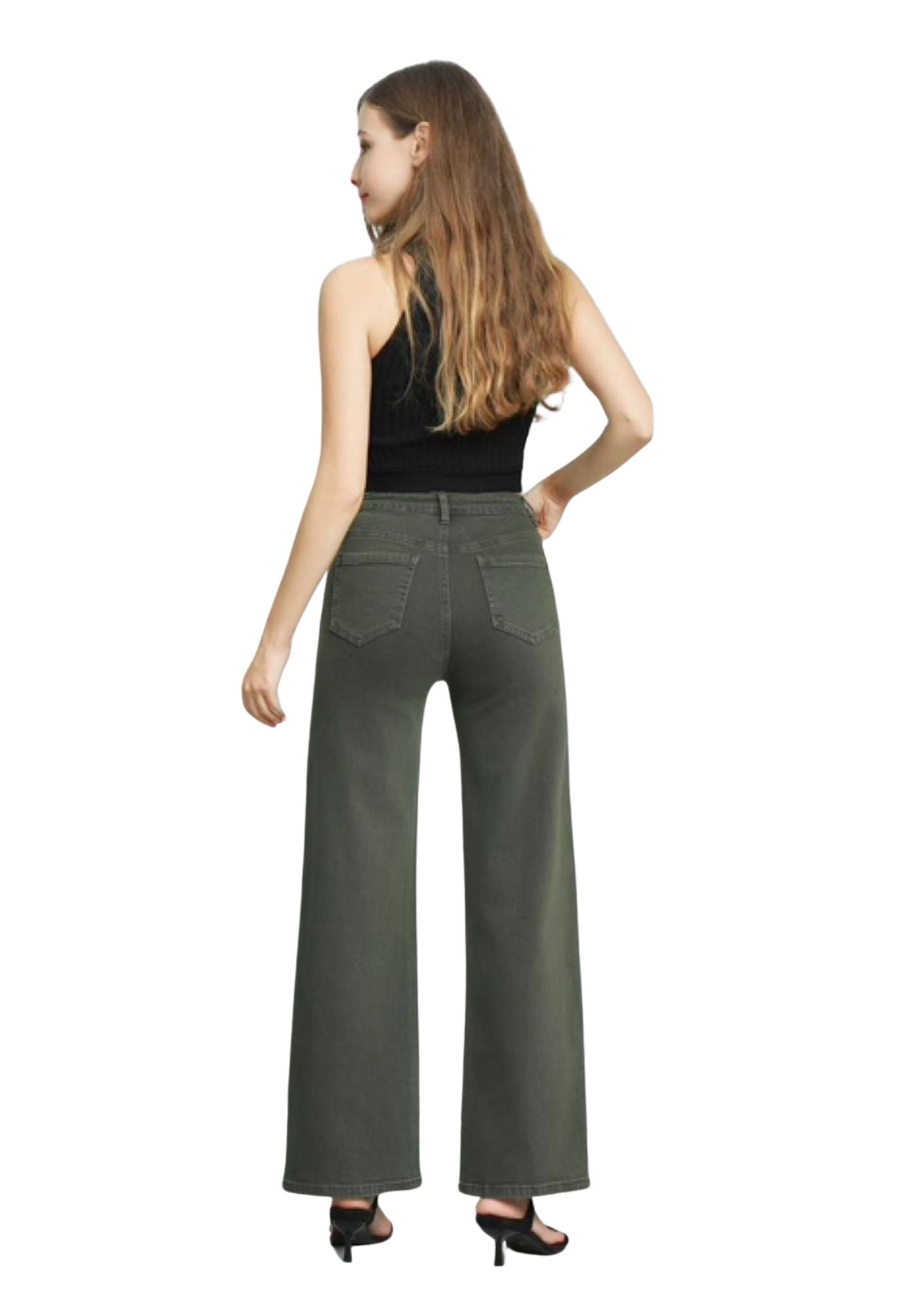 Este vaquero Priscila en verde kaki combina estilo y comodidad con su diseño de pierna ancha y cintura elástica.